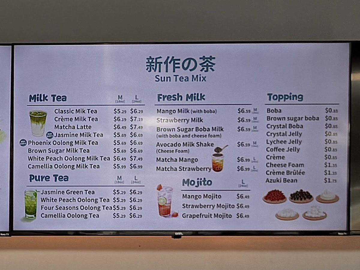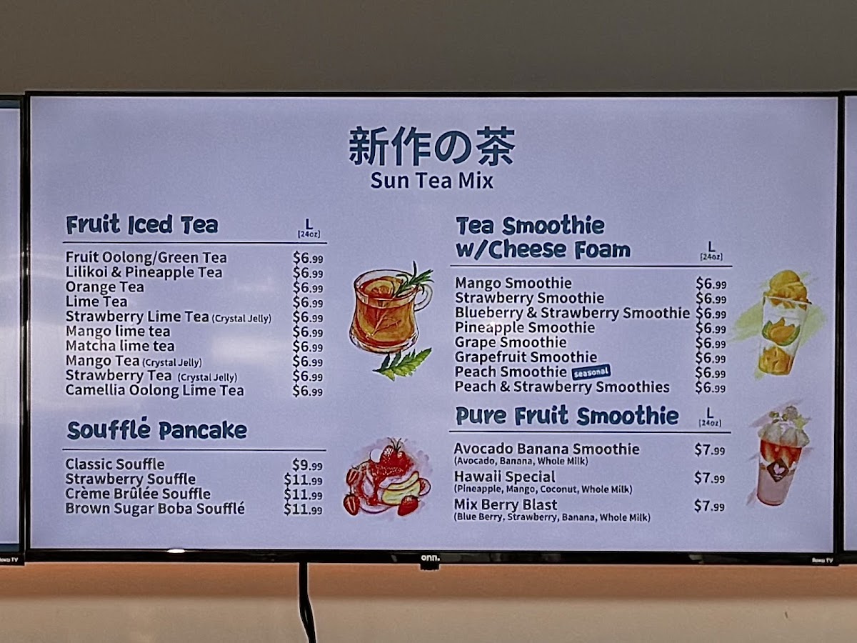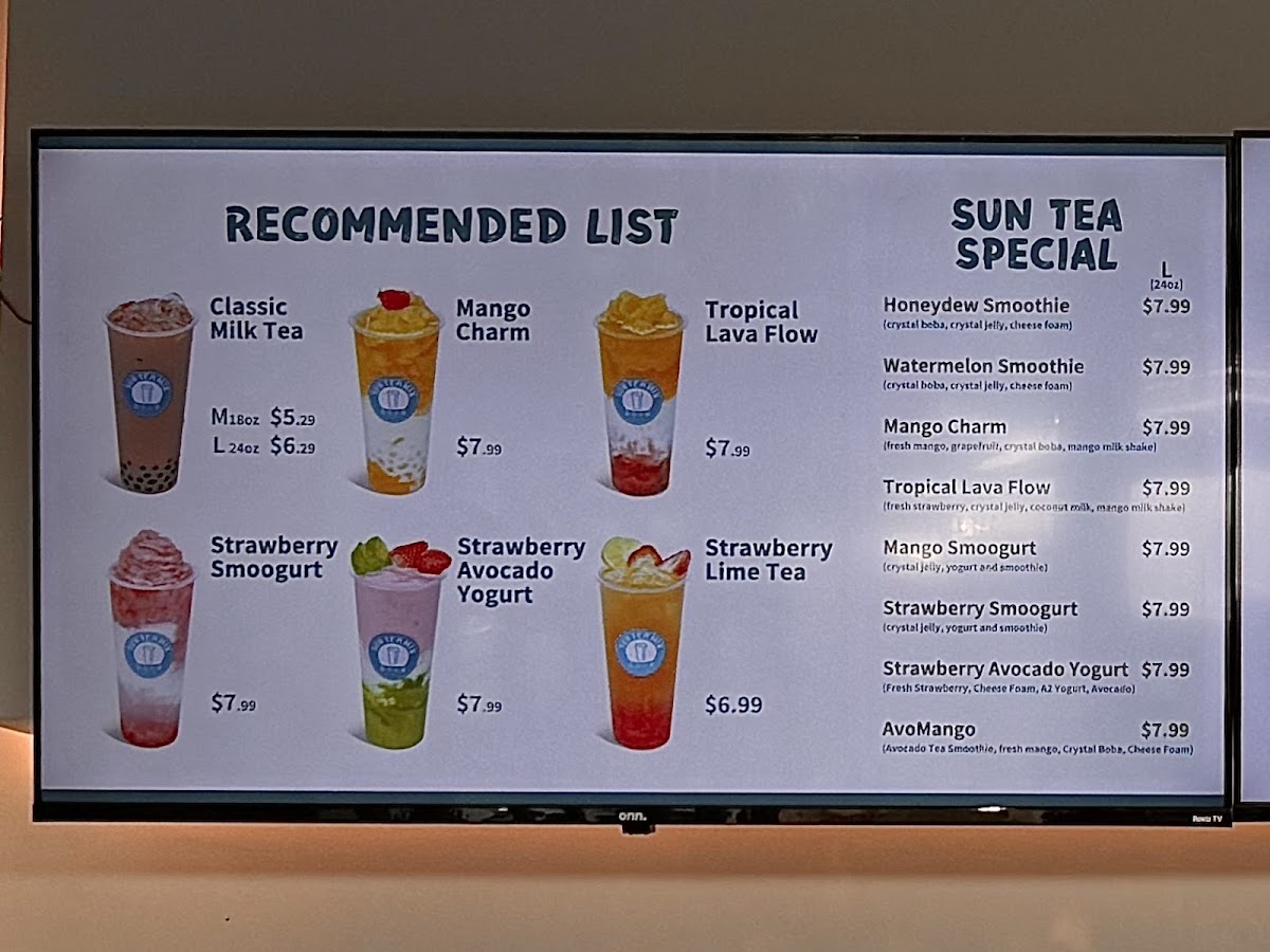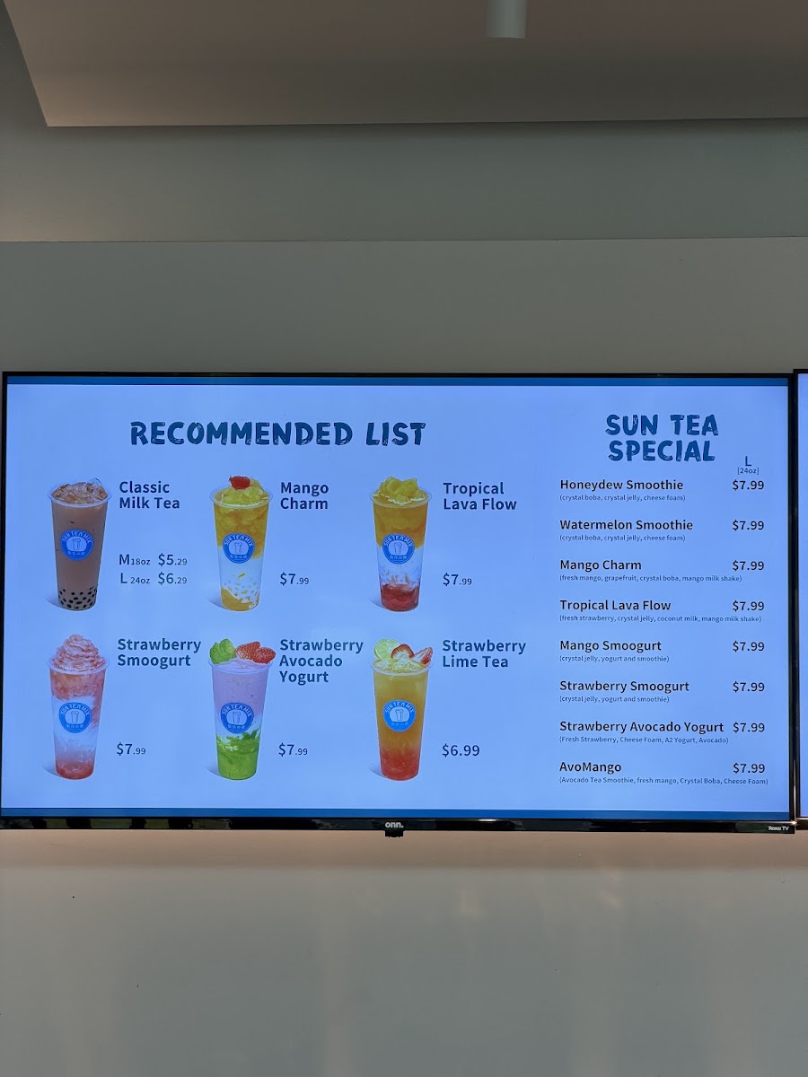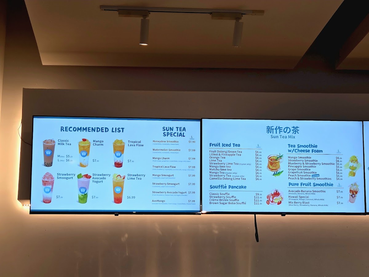 Sun Tea Mix offers an extensive and diverse menu perfect for anyone craving refreshing beverages and delightful treats. Their Sun Tea Specials include refreshing options like the Watermelon Smoothie, Mango Charm, and Tropical Lava Flow, alongside unique concoctions such as the Strawberry SmoogurtMango Smoogurt. If you're looking for a creamy, satisfying drink, their Pure Fruit Milkshakes like the Avocado Banana Milk Shake and Mix Berry Blast are delightful options. For those with a sweet tooth, their Soufflé Pancakes provide indulgent choices, including the Crème Brûlée Soufflé and Brown Sugar Boba Soufflé. Tea lovers will appreciate the Pure Tea options, featuring flavors such as Jasmine Green Tea (M) and Four Seasons Oolong Tea (L). The Milk Tea selection, with varieties like White Peach Oolong Milk Tea (M) and Phoenix Oolong Milk Tea (M), is another crowd favorite. Their CoCo series presents fruity combinations like the Classic CoCo and Strawberry Coco. If you prefer something rich, the Fresh Milk options, including Brown Sugar Boba Milk and Matcha Mango, are perfect for a creamy indulgence. The Smoothie w/ Cheese Foam section offers fun options like the Blueberry & Strawberry Smoothie and Grape Smoothie, and for those who enjoy a tangy twist, the Fruit Iced Tea options, such as the Lime Tea and Mango Lime Tea, provide a refreshing pick-me-up. Lastly, their Mojitos like the Grapefruit Mojito and Strawberry Mojito are a great way to unwind. Each menu item caters to a variety of tastes, making Sun Tea Mix a perfect spot for anyone looking for something unique and delicious.