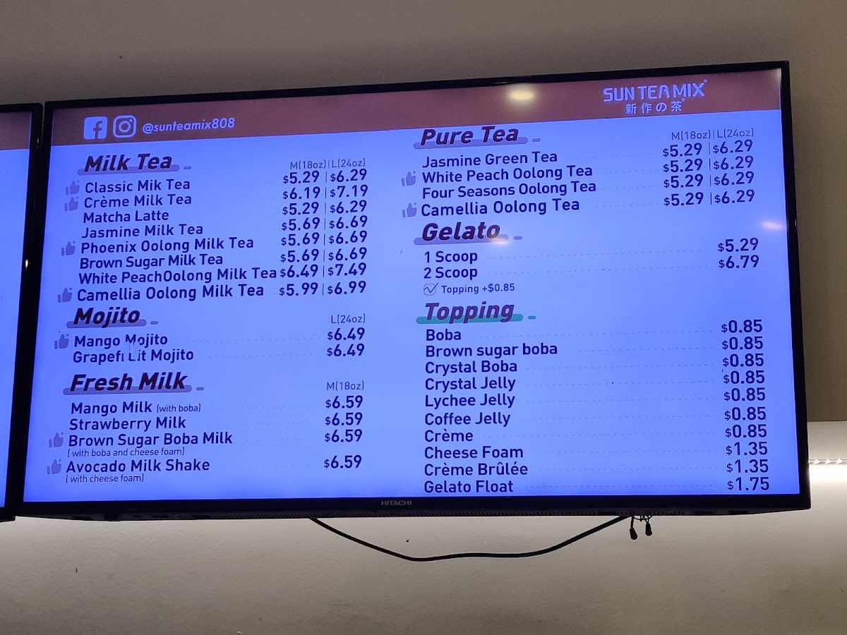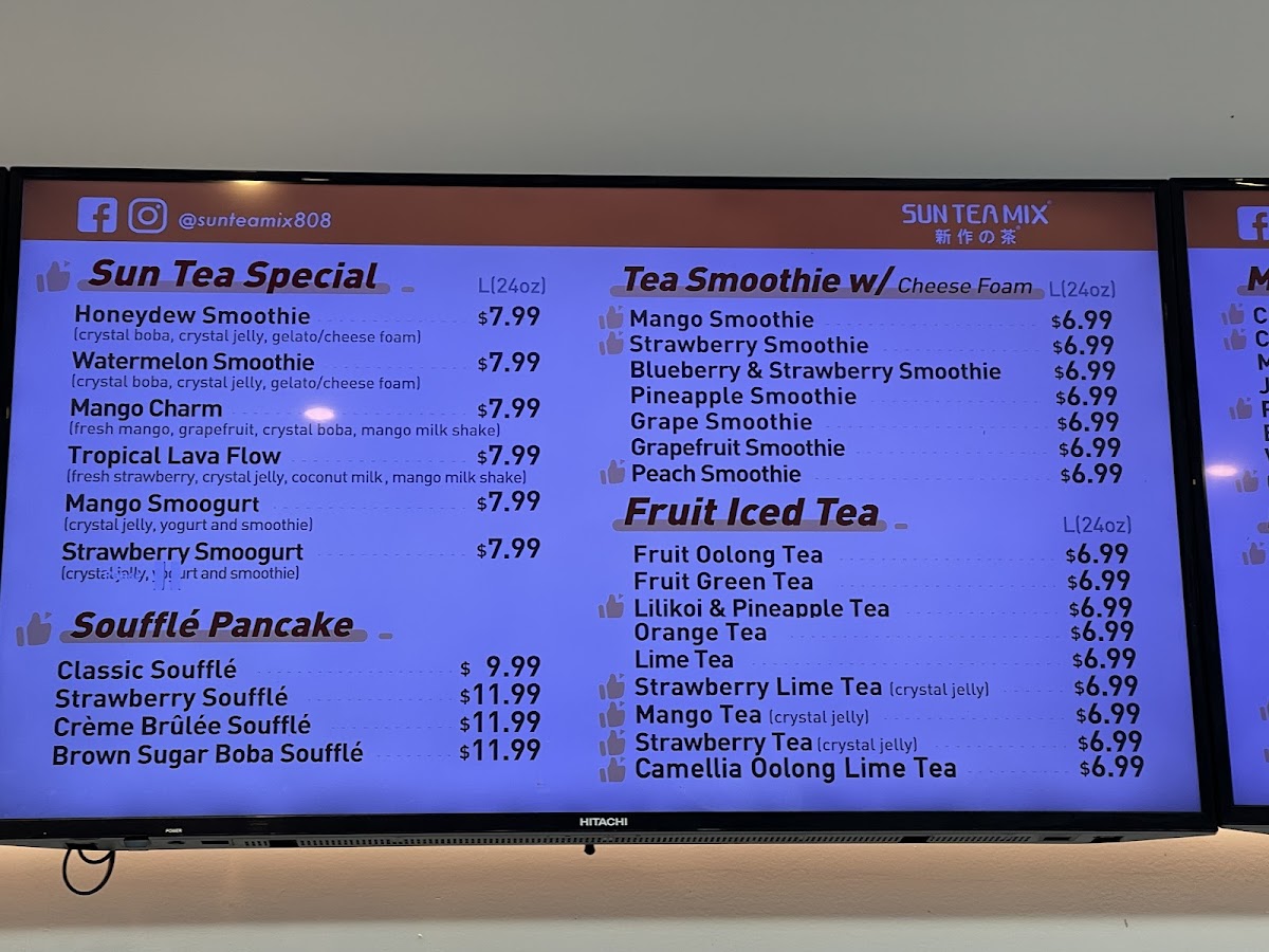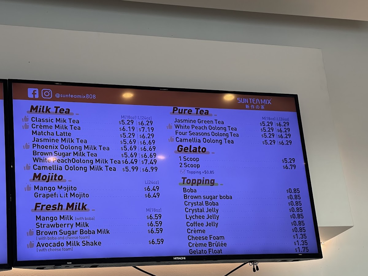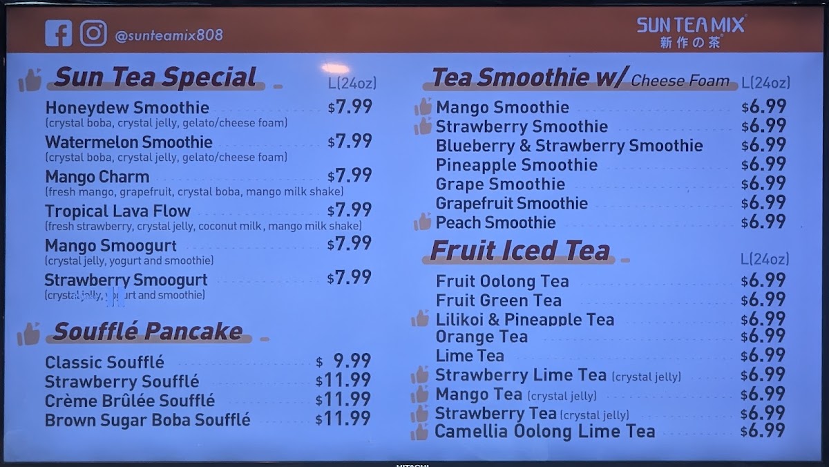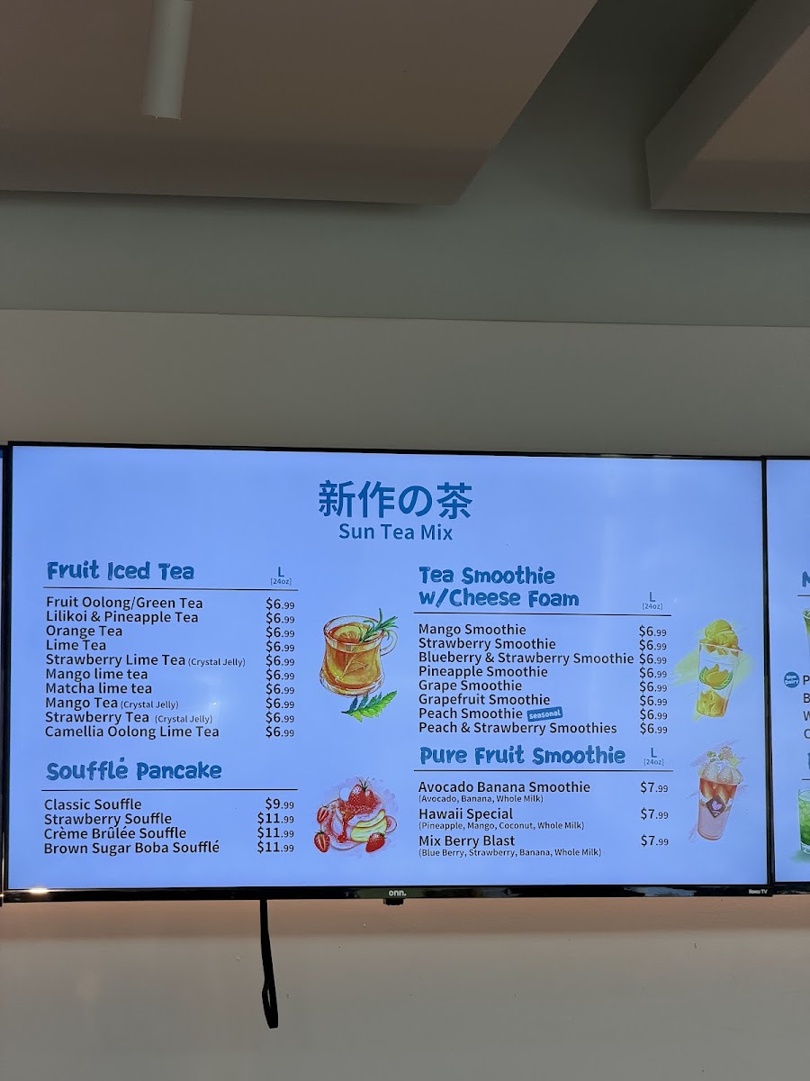Sun Tea Mix offers an extensive and diverse menu perfect for anyone craving refreshing beverages and delightful treats. Their Sun Tea Specials include refreshing options like the Watermelon Smoothie, Mango Charm, and Tropical Lava Flow, alongside unique concoctions such as the Strawberry SmoogurtMango Smoogurt. If you're looking for a creamy, satisfying drink, their Pure Fruit Milkshakes like the Avocado Banana Milk Shake and Mix Berry Blast are delightful options. For those with a sweet tooth, their Soufflé Pancakes provide indulgent choices, including the Crème Brûlée Soufflé and Brown Sugar Boba Soufflé. Tea lovers will appreciate the Pure Tea options, featuring flavors such as Jasmine Green Tea (M) and Four Seasons Oolong Tea (L). The Milk Tea selection, with varieties like White Peach Oolong Milk Tea (M) and Phoenix Oolong Milk Tea (M), is another crowd favorite. Their CoCo series presents fruity combinations like the Classic CoCo and Strawberry Coco. If you prefer something rich, the Fresh Milk options, including Brown Sugar Boba Milk and Matcha Mango, are perfect for a creamy indulgence. The Smoothie w/ Cheese Foam section offers fun options like the Blueberry & Strawberry Smoothie and Grape Smoothie, and for those who enjoy a tangy twist, the Fruit Iced Tea options, such as the Lime Tea and Mango Lime Tea, provide a refreshing pick-me-up. Lastly, their Mojitos like the Grapefruit Mojito and Strawberry Mojito are a great way to unwind. Each menu item caters to a variety of tastes, making Sun Tea Mix a perfect spot for anyone looking for something unique and delicious.